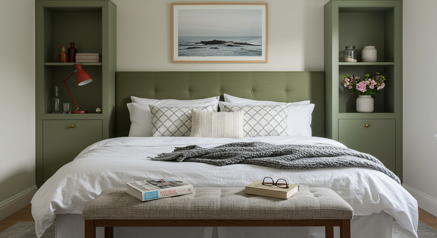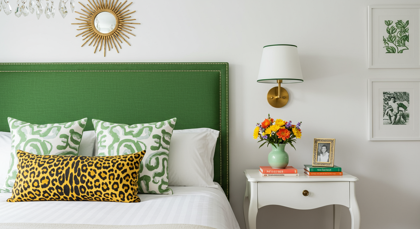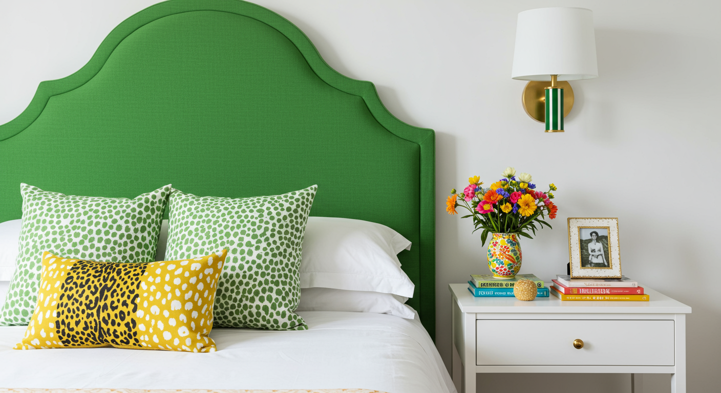 Pair lush pattern with liveable color. For a unique take on the traditional headboard, a custom olive triptych one is the perfect backdrop for the animated, global patterns that outfit this slumber sanctuary.