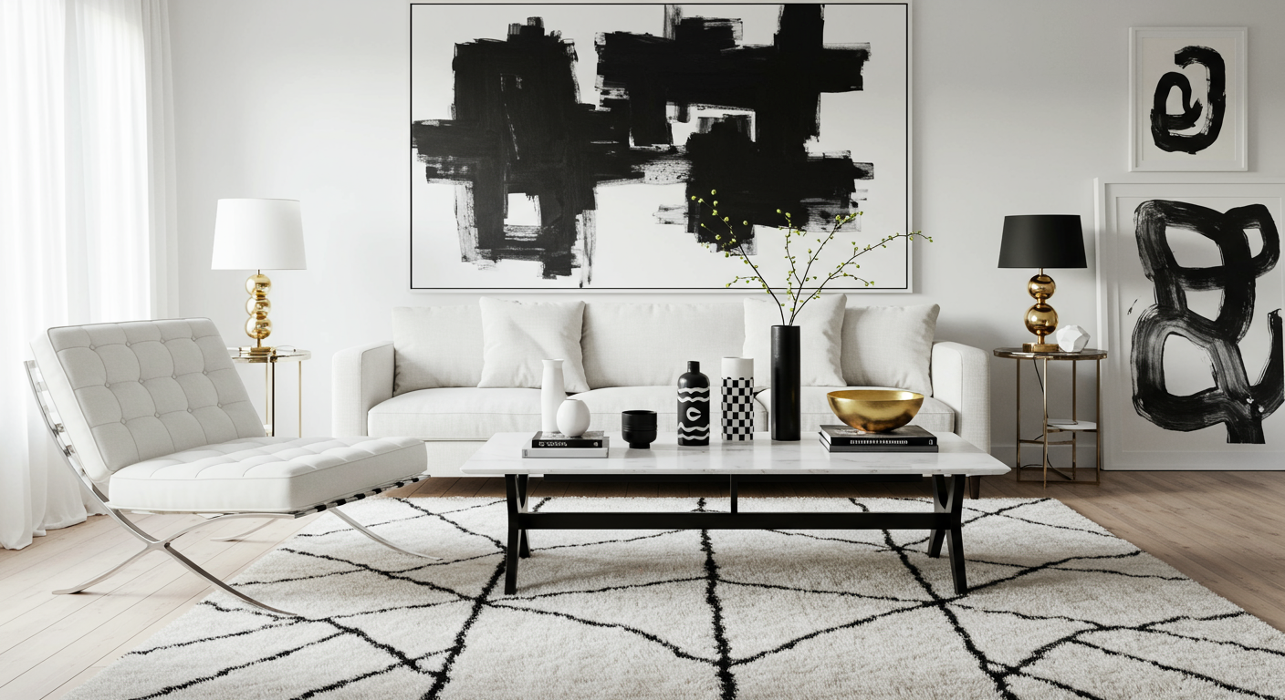 Bring in oversized accents. Exuding a simple glamour, the living room in designer Christine Ralphs’ urban, one-bedroom condo combines a large-scale artwork, rug and graphic black sconce for unmatched gravitas. The scale of the pieces is what really gives this small space its grandeur.
