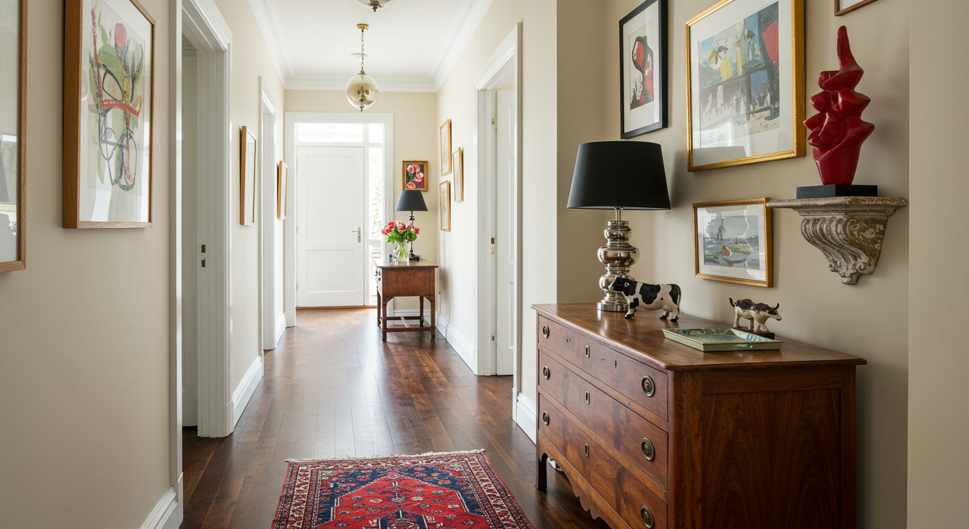 Layer in luxe pieces. With limited square feet, the trick to maximizing style is easy: it’s a layering game. Here, a Georgian chest, Persian carpet and gallery wall combine for an entry hall that feels decidedly luxurious.