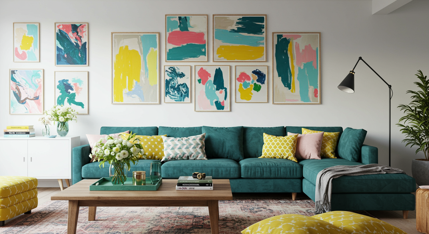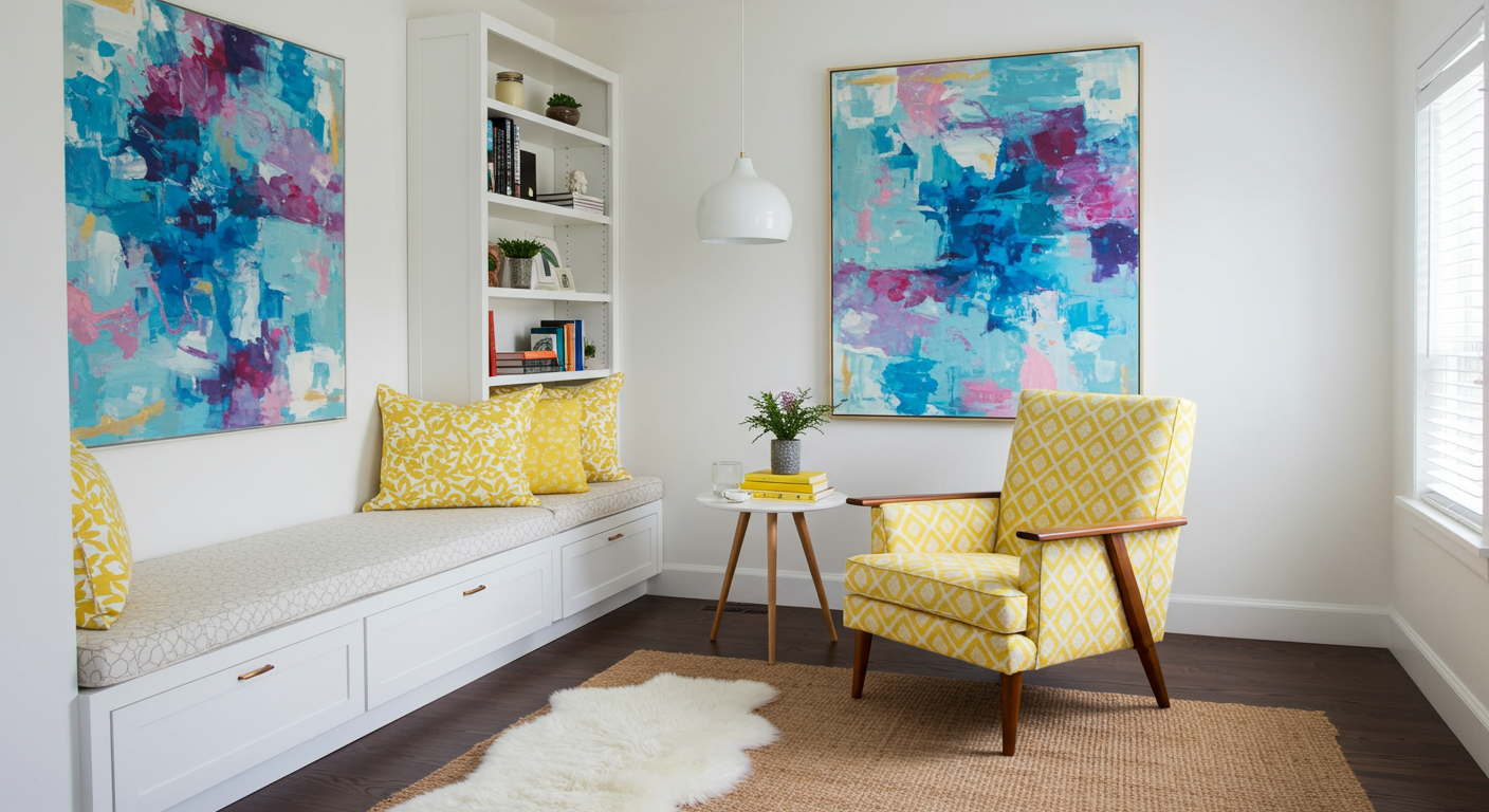 Infuse pops of color. A dynamic, abstract artwork provides a richly-colored escape when decorating an all-white space. Splashes of zesty chartreuse energize the artful swirls of teal, navy, and pink behind.