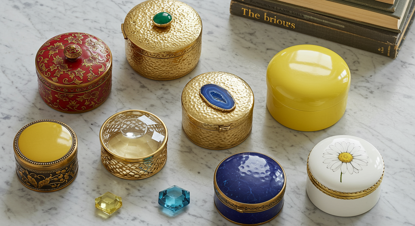 Create an arrangement with unique objects. A tribe of jewel-like trinket boxes are a clever and compact way to maximize storage space whilst artfully decorating your tabletops.