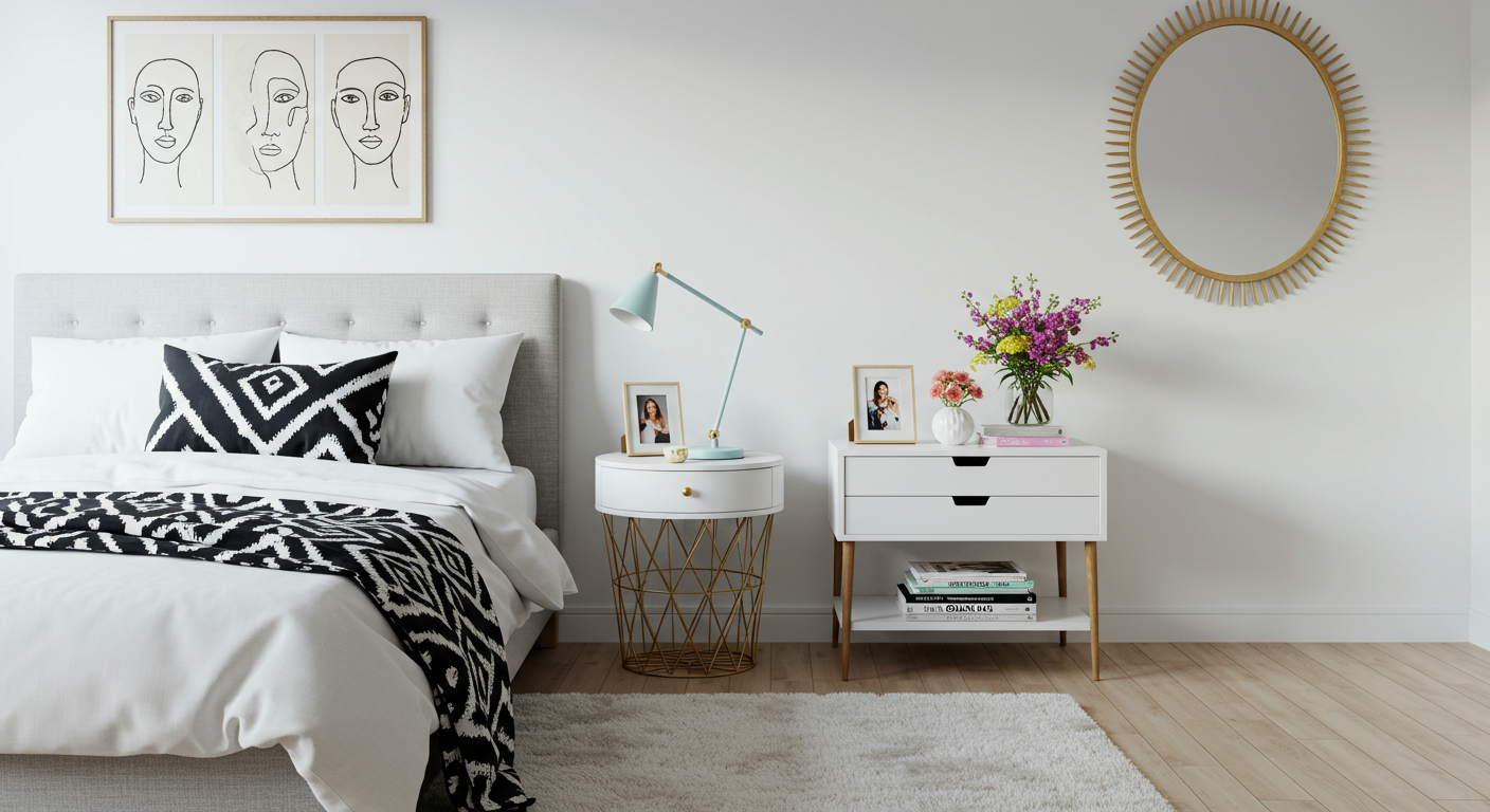 Double up on storage. Small space living doesn’t mean you have to give up on storage or style. A clever pairing of a brass side table and shagreen console mean this bedroom has space to store bedside necessities and the odd book or two for bedtime reading.