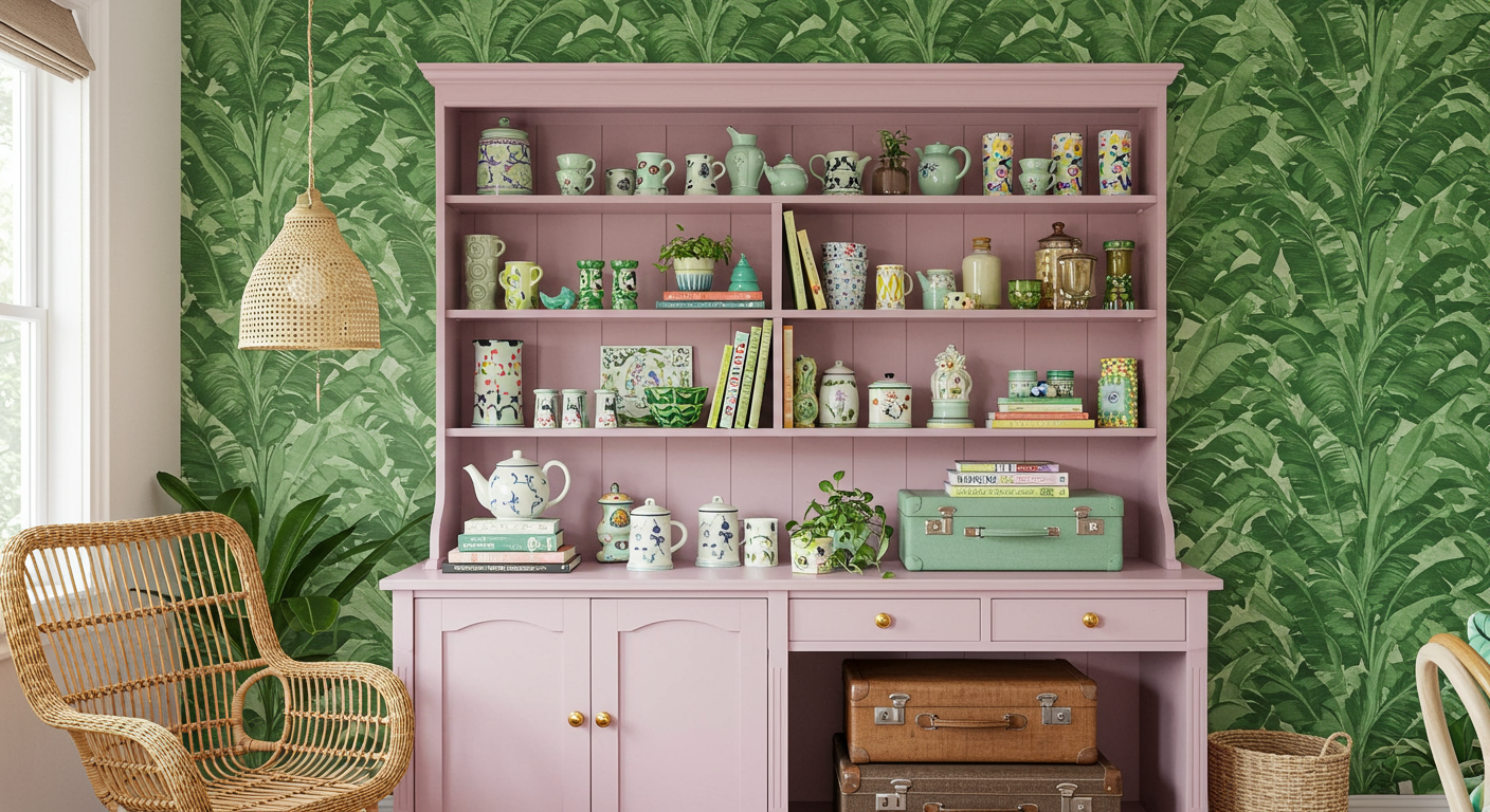 Paint the town pink (or, whatever color you prefer!). A sea of pink is the perfect backdrop for dining essentials and odd curiosities in this tropical-inspired dining area featuring a painted hutch and groovy palm wallpaper.