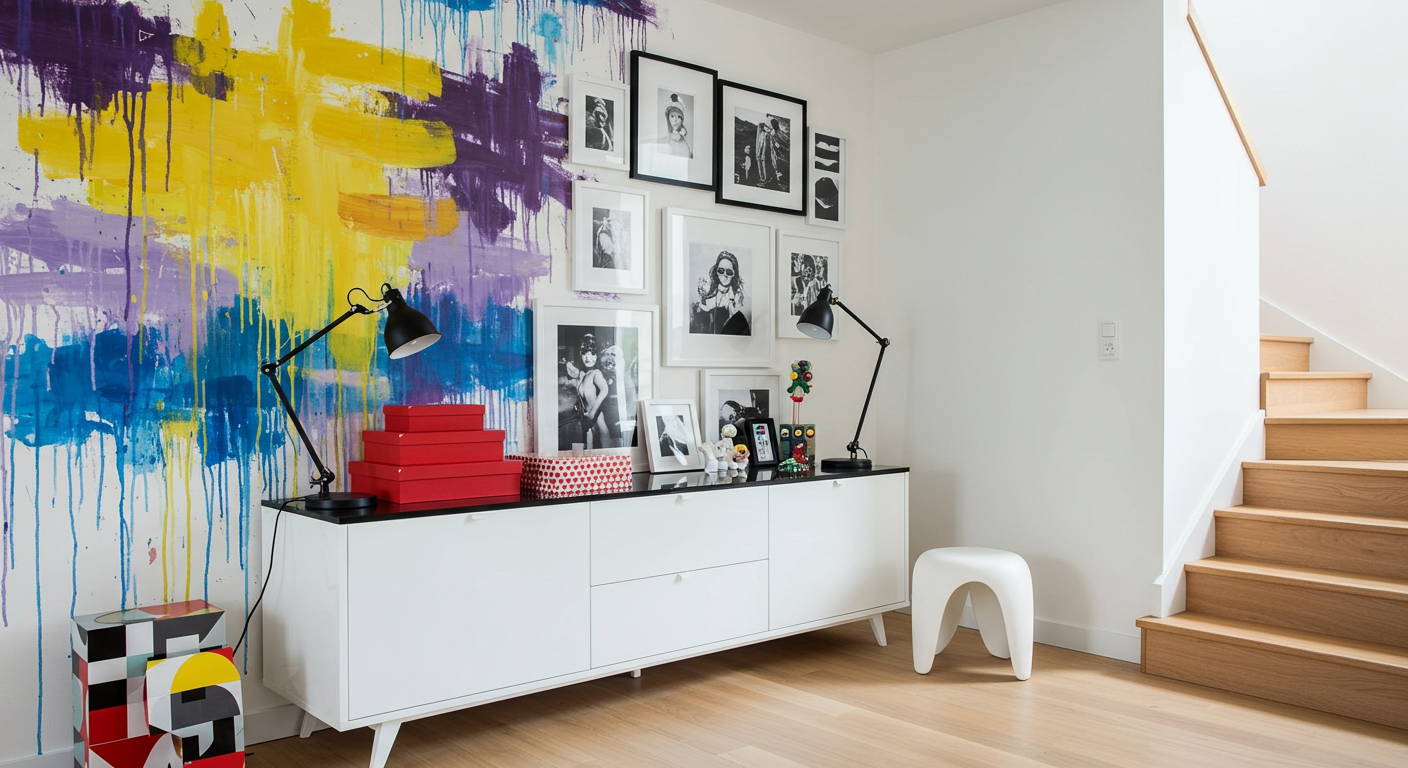 Warm up busy rooms with wood flooring. From the gallery wall to the graffiti-esque wallpaper coloring this artful loft, oiled white oak floors are a cozy compliment that keep the space from overwhelming.