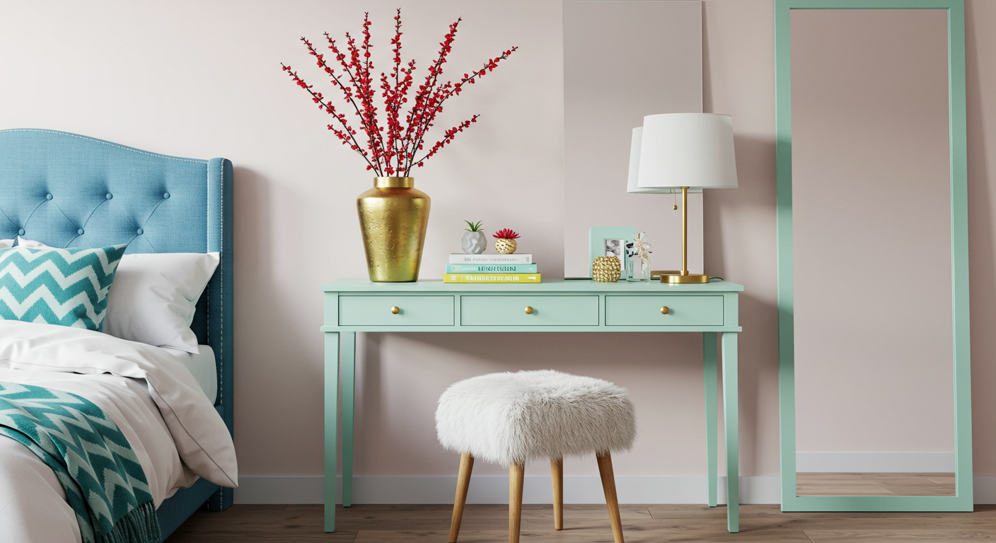 Treat your vanity like a vignette. Inspired by pastel hues reminiscent of the Caribbean, this pretty bedroom’s makeup table supports both books and foliage offset with a floor-length, get-ready-with-me mirror.