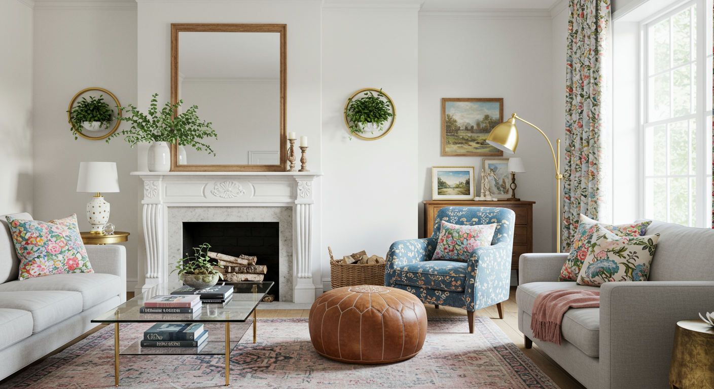 Bring new life to existing pieces. Homey, reupholstered vintage chairs are a snug addition to this 900-square-foot eclectic family home and play nicely with the casual tan pouf that doubles as an ottoman and perch.