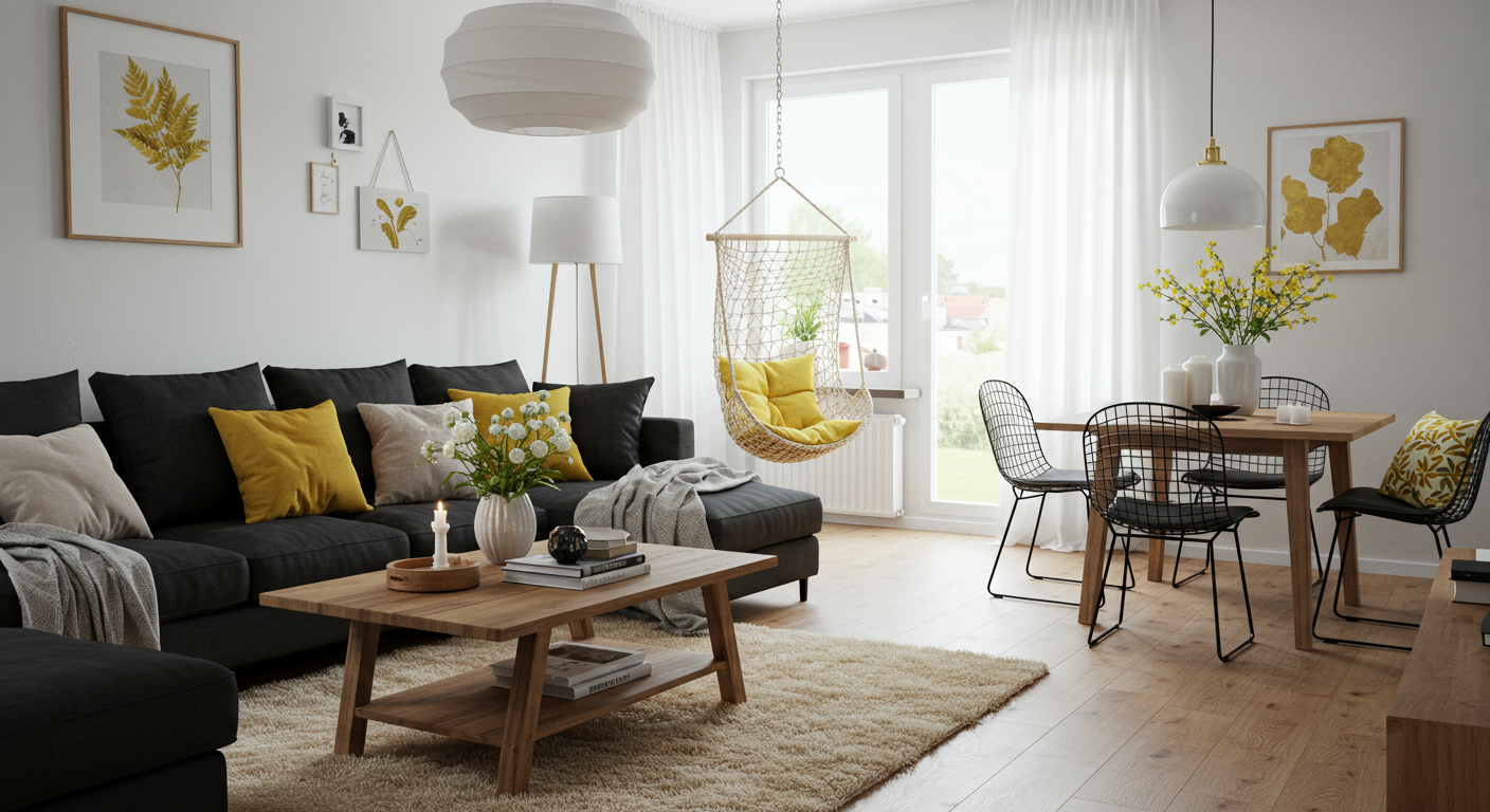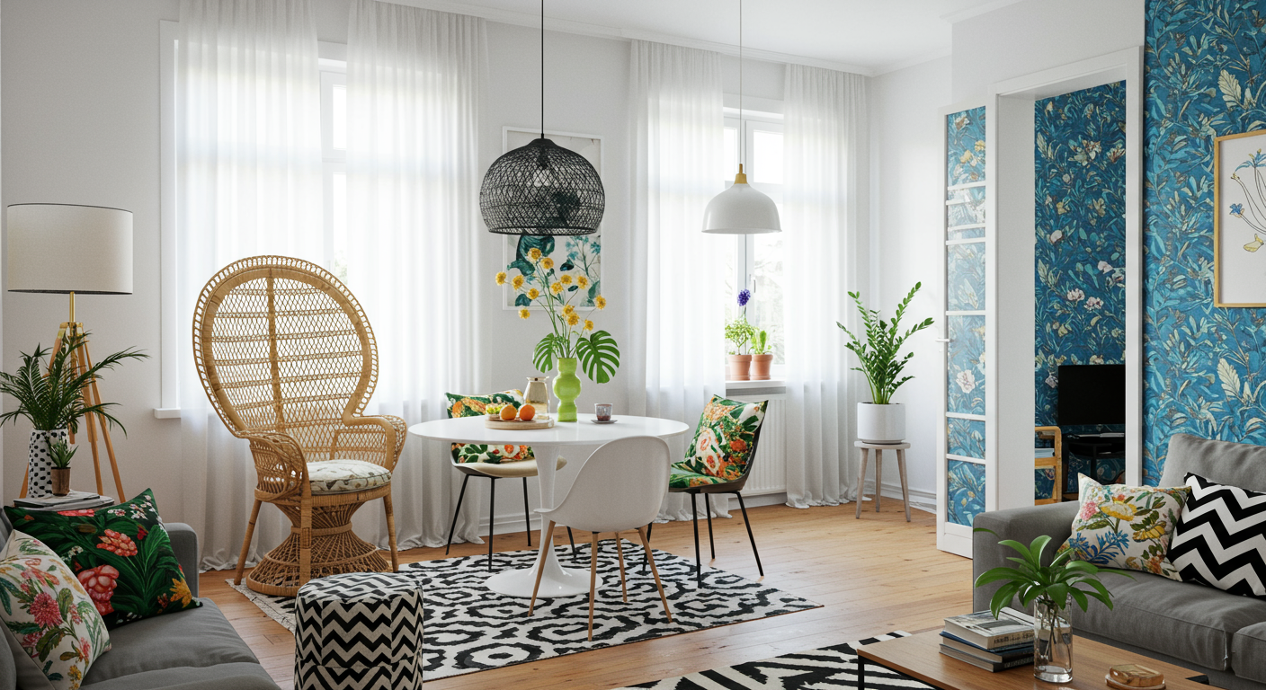 Separate rooms with color. In this open-concept living space, a bold injection of black, white, and natural rattan brings drama to the dining area, while a splash of blue and white accents work hard to define the kitchen behind.