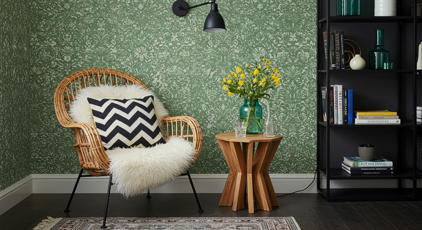 Make a statement with a feature wall. Covering a single wall in a patterned paper can make all the difference. Paired with wood tones and natural motifs, this space imbues an earthy quality.